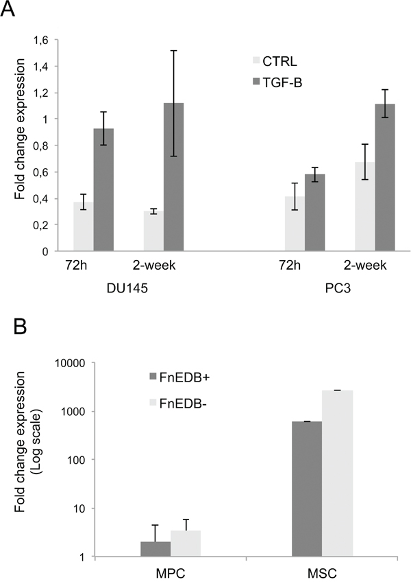 Figure 3: Fibronectin ED-B mRNA expression in Du145 and PC3 cell lines after 72h and 2 weeks A. Fibronectin ED-B expression in MPC, P2-MSC and Du145 treated for 2 weeks B.