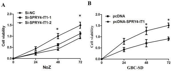 To further explore the function of SPRY4-IT1 in GBC, the expression level of SPRY4-IT1 was examined using qRT-PCR in four GBC cell lines. The expression of SPRY4-IT1 was observed to be higher in all four GBC cell lines compared with the 293T cell line. As shown in Figure 1B, the result of qRT-PCR revealed that NoZ cells showed higher expression of SPRY4-IT1; however, GBC-SD cells showed lower expression of SPRY4-IT1. Thus, we used NoZ and GBC-SD cells as a model to investigate the biological consequences of SPRY4-IT1in regulating cancer cell proliferation and invasion.
