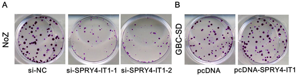 Figure 4. A. Colony-formation assays showed that silencing of SPRY4-IT1 significantly inhibited the colony-forming ability of NoZ cells compared to the negative control; B. Colony-formation assays showed that overexpression of SPRY4-IT1 significantly increased the colony-forming ability of GBC-SD cells compared to control.