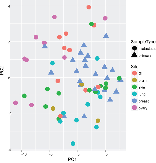 Overall, only few differentially expressed miRs were found between primary tumors and matched metastases (with an exception for ovarian metastases), suggesting that miR expression is largely retained in metastases. Ferracin et al. already showed that primary tumors of different origin display a distinct miR expression profile and that metastases retain a large part of these miRs [34]. The latter was visualized by unsupervised hierarchical clustering, where primary tumors and metastases clustered together. We also observed some clustering of primaries and paired metastases, but the metastatic locations hardly clustered. This could be due to patient specific differences or to too much variation within subsites (different GI and skin locations).