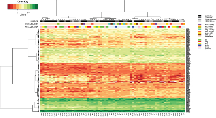 Intrinsic (molecular) subtypes of breast cancer have been shown to preferentially metastasize to specific sites. E.g., while luminal ERα-positive cases prefer to seed to the bone, triple negative and HER2-driven cancer metastases often go to the brain [12]. We therefore set out to study global miR expression patterns of 23 primary breast cancer specimens and their corresponding multiple solid distant metastases on selected locations, to pinpoint changes in miR expression during progression from the primary tumor to specific distant sites.