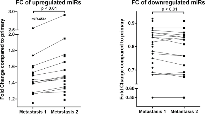 A general tendency was observed towards a higher expression in the second metastasis compared to the first. Especially in the significantly upregulated miRs, an increase in fold change was shown in the second metastasis (compared to the primary tumor) relative to the first metastasis (Figure 3). However, no significant correlation was seen between miR expression and time between primary and metastasis. As an example, the miR with the highest upregulation (miR-451a; FC M1: 2.55 and FC M2: 2.91) was plotted against timespan between primary and metastasis and metastatic location (Supplementary Figure S4). Location of metastasis and patient specific differences were the largest contributors to the differences in miR expression. Time to distant recurrence was not significantly different (p=0.637) between the metastatic locations of cohort 1 (Supplementary Figure S5).