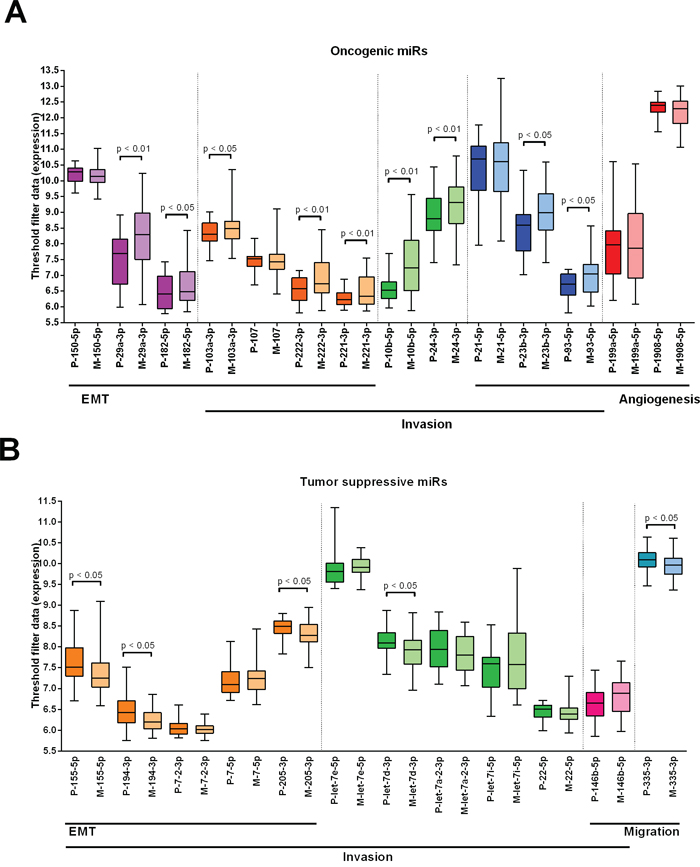 Figure 4: Expression differences in primary tumors and metastases of miRs known to have an oncogenic and tumor suppressive potential in primary breast tumors. Data from cohort 1. A. Expression of 15 oncogenic miRs with a role in EMT, invasion and angiogenesis in primary tumors versus metastases. B. Expression of 12 tumor suppressive miRs with a role in EMT, invasion and migration in primary tumors versus metastases. Wilcoxon signed-rank test was used with * p < 0.05, ** p < 0.01, *** p < 0.001. Purple: miRs with a role in EMT, orange: miRs with a role in EMT and invasion, green: miRs with a role in invasion, blue: miRs with a role in invasion and angiogenesis, red: miRs with a role in angiogenesis, pink: miRs with a role in invasion and migration, turquoise: miRs with a role in migration.