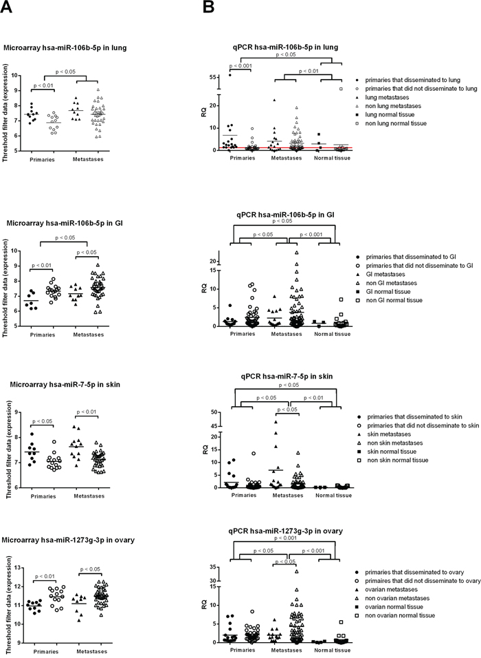 Figure 5: MiRs shown to be predictive in the primary tumor for metastasis location. A. with microarray profiling of cohort 1, miR-106b-5p was an independent predictor for lung and GI metastases, miR-7-5p for skin metastases and miR-1273g-3p for ovarian metastases. B. qPCR validation on the same cohort plus an independent cohort revealed the same trend as in A), but only miR-106b-5p remained an independent predictor for lung metastases. Mann-Whitney U test was used with * p < 0.05, ** p < 0.01, *** p < 0.001