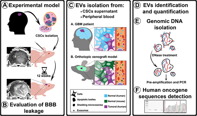 Figure 1: Experimental procedure flowchart. A. Isolated hCSCs from 2 GBM patients were xenotransplanted in athymic mice. After 12 weeks, the animals were transcardially perfused. B. BBB permeability was evaluated using three assays: MRI, Evans Blue staining, and albumin extravasation. C. EVs (ABs, SMVs, and EXOs) were isolated from hCSCs-enriched culture supernatants and from mouse peripheral blood. D. EVs were identified using TEM, tracking analysis, and CD63 tetraspanin quantification. E. To ensure that the analyzed DNA was confined within the EVs, supernatants and plasma were treated with DNase before gDNA isolation; after the isolation, gDNA was pre-amplified before performing PCR analysis with human-specific primers. F. Sequences detected were sequenced to confirm their human origin.