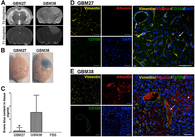 Figure 2: Evaluation of BBB leakage in two GBM models: GBM27 presents an intact BBB. A. Representative T2- and T1-weighted images of GBM27 and GBM38. The GBM27 tumor xenotransplant T2-weighted image depicts diffuse hyperintense infiltrative involvement. GBM38 xenograft tumor showed well-defined borders. T2-weighted images revealed a hyperintense mass compressing ventricular structures. GBM27 features an intact BBB, as revealed by the lack of any contrast enhancement. GBM38 shows a homogeneous enhancement, suggesting that the BBB integrity is compromised. B. Evans Blue extravasation. Examination of the brains of perfused animals previously stained with Evans Blue confirmed BBB disruption in the GBM38 model. C. Quantification of Evans Blue extravasation. *P <0.05. D-E. Immunofluorescence staining of human vimentin (yellow), mouse CD105 (green), and mouse albumin (red). Nuclei were stained with DAPI (blue). GBM27 presents no sign of albumin staining throughout the tissue, which indicates that the BBB is intact. GBM38 features a leaky BBB, as shown by albumin spreading (white asterisk) from the blood vessels (white arrows) through the tissue. Total slides with anti-human vimentin are shown in Fig S1. Scale bar: 50 μm.