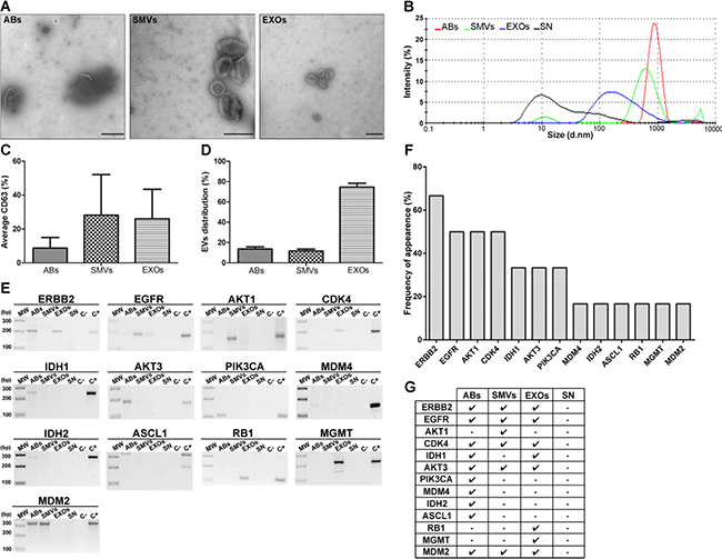 Figure 3: Morphological characterisation of EVs isolated from hCSCs supernatant from GBM27 and gDNA isolation. A. Transmission electron microscopy images. ABs (500 nm to 1 μm), SMVs (500–150 nm) and EXOs (150–60 nm). B. Size distribution of EVs, as measured using Nanosizer tracking analysis. C. Quantification of the tetraspanin cell-surface glycoprotein CD63. D. Relative distribution of EVs. E. Most representative sequences analyzed are present in EVs isolated from GBM27 cells. F. Histogram showing the frequency of occurrence of target sequences after 6 consecutive experiments. G. Presence of ERBB2, CDK4, AKT3, and MDM2 sequences in all types of EVs. The remaining sequences were found randomly in ABs, SMVs, and EXOs. No sequences were detected in the supernatant. Scale bars: 1 μm (ABs), 0.2 μm (SMVs and EXOs).