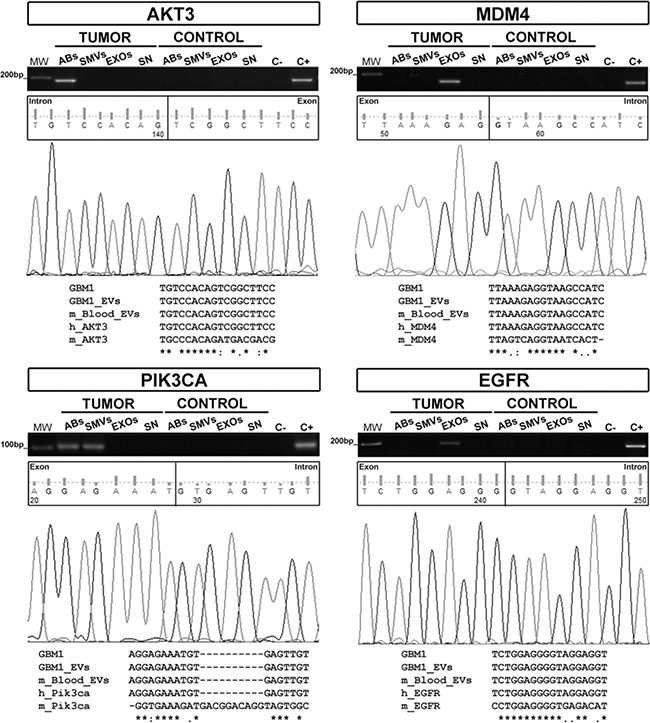 The GBM27 orthotopic xenotransplant model was used to analyze whether all three types of GBM27-derived EVs can carry relevant human gDNA sequences, cross the undisrupted BBB and reach the bloodstream. We hypothesised that if this was the case, we should be able to detect relevant human gDNA sequences within the pool of EVs (both mouse and human) isolated from peripheral blood. Thus, we isolated and separated all three types of EVs from plasma obtained from the inferior vena cava, isolated total DNA from each type of EV and performed PCR assays to specifically amplify human gDNA sequences. PCR-amplification products of the expected sizes were obtained for AKT3 from ABs, PIK3CA from ABs and SMVs, and MDM4 and EGFR from EXOs. Multiple sequence alignment showed a complete homology among these sequences and their counterparts from the supernatants of hCSCs-enriched cultures (Figure 4).