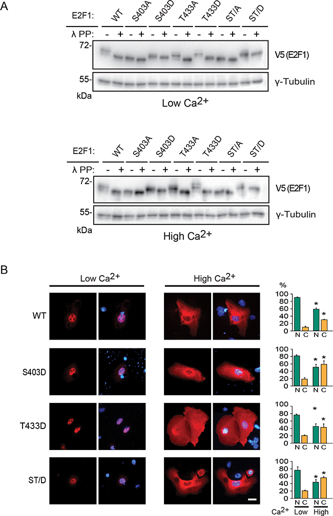 Figure 4: Characterization of pseudophosphorylated E2F1 mutant proteins. A. Undifferentiated keratinocytes were transfected with vectors encoding V5-tagged wild type (WT) or the indicated E2F1 mutant proteins. Four hours after transfection, the culture medium was replaced with Low Ca2+ or High Ca2+ medium. After 24 h, cell lysates were prepared and incubated in the presence or absence of λ phosphatase (λ PP; 4 U/mg of lysate protein), resolved on denaturing polyacrylamide gels, and analyzed by immunoblot, with antibodies against V5 or γ-tubulin, used as loading control. The results shown are representative of three experiments. B. Cells transfected as described in (A) were processed for immunofluorescence microscopy following 24 h of incubation in Low Ca2+ or High Ca2+ medium, using anti-V5 antibodies. DNA was visualized with Hoechst 33342. The values in the histograms represent the percentage of cells (mean + SEM, n=3) that exhibited nuclear (N) or cytoplasmic (C) E2F1 distribution. The asterisks indicate P<0.05 relative to values in the corresponding subcellular compartments in Low Ca2+ medium (ANOVA). Bar, 16 μm.