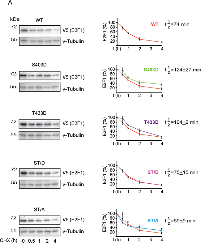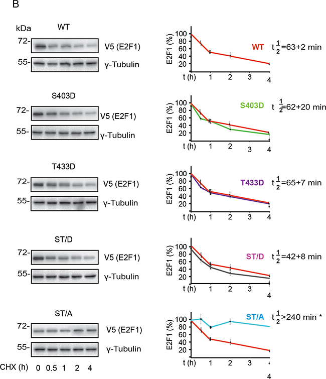Figure 5: S403 and T433 regulate E2F1 protein half-life in differentiated keratinocytes. Undifferentiated keratinocytes were transfected with vectors encoding V5-tagged wild type (WT) or the indicated E2F1 mutant proteins. Twenty-four hours after transfection, the culture medium was replaced with Low Ca2+ (panel A) or High Ca2+. Undifferentiated keratinocytes were transfected with vectors encoding V5-tagged wild type (WT) or the indicated E2F1 mutant proteins. Twenty-four hours after transfection, the culture medium was replaced with High Ca2+ (panel B) medium, followed by addition of cycloheximide (100 μg/ml, final). Cell lysates were prepared from replicate samples at the indicated times thereafter, and analyzed by immunoblot using anti-V5 antibodies, to detect E2F1, or γ-tubulin, used as loading control. Representative blots for each E2F1 protein are shown. The graphs represent the densitometric quantification of E2F1 protein levels (mean ± S.D., n=3) calculated from experiments conducted on three independent keratinocyte isolates, and are expressed as a percent of levels measured at t=0, set to 100%. Decay curves were used to calculate the apparent half-life of each E2F1 protein (t½), showed on its corresponding graph. For each plot, the decay curve for wild type E2F1 is shown in red, for comparison. The asterisks indicate P<0.05 relative to t½ of wild type E2F1 (ANOVA).