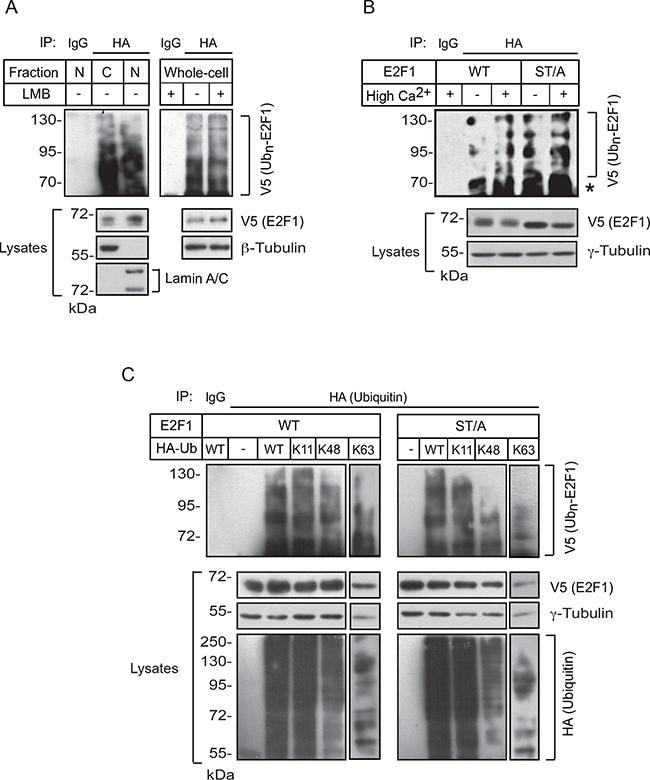 Figure 6: E2F1 ubiquitylation in keratinocytes. A. Undifferentiated keratinocytes were transfected with vectors encoding wild-type V5-tagged E2F1 and HA-tagged ubiquitin. Twenty-four hours later, MG132 (10 μM, final) was added to the culture medium, followed 3 h later by leptomycin B (LMB, 10 ng/ml, final) or ethanol (vehicle). Cultures were incubated in the presence of both drugs for 30 min, at which time the Ca2+ concentration was adjusted to 1.0 mM. Lysates containing whole-cell, nuclear (N) or cytoplasmic (C) fractions were prepared 2.5 h later, HA-ubiquitin immunecomplexes were isolated, resolved by denaturing gel electrophoresis, and analyzed with anti-V5 antibodies to detect ubiquitylated V5-tagged E2F1. Antibodies against β-tubulin or lamin A/C were used to verify the purity of the fractionated extracts and as loading controls. B. Undifferentiated keratinocytes were transfected with vectors encoding HA-tagged ubiquitin and V5-tagged wild type or ST/A E2F1, cultured in Low (-) or High (+) Ca2+ medium, as indicated, and treated with MG132 as in panel (A). HA or unrelated IgG immunecomplexes were isolated from whole-cell lysates and analyzed by immunoblot with anti-V5 antibodies. The abundance of exogenous E2F1 proteins in the lysates was analyzed by immunoblot, using γ-tubulin as loading control. The asterisk indicates the IgG heavy chain. C. Keratinocytes cultured in Low Ca2+ medium were transfected with vectors encoding the indicated V5-tagged E2F1 and HA-tagged ubiquitin proteins. Twenty-four hours after transfection, cells were incubated in the presence of MG132 (10 μM, final) for 6 h. Cell lysates were prepared and HA or unrelated IgG immunecomplexes were isolated and analyzed by immunoblot with anti-V5 antibodies. The abundance of exogenous E2F1 and HA-ubiquitin-containing proteins in the lysates was analyzed by immunoblot, using γ -tubulin as loading control. Ubn-E2F1 indicates ubiquitylated V5-tagged E2F1 proteins. All results shown are representative of three replicate experiments conducted with independent cell isolates.