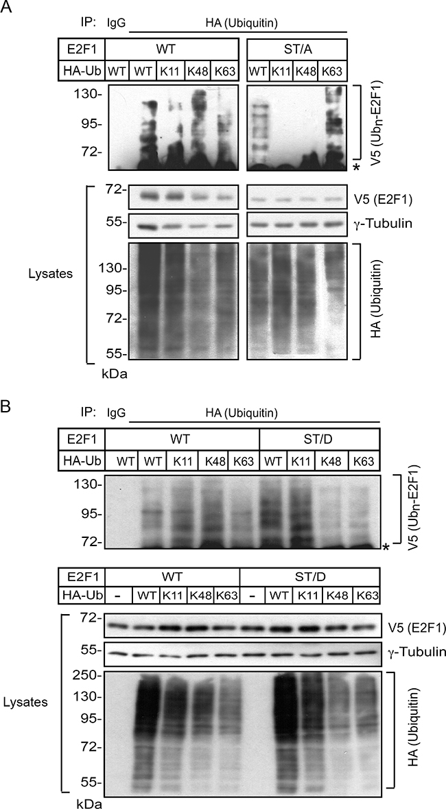 Figure 7: S403 and T433 regulate K11- and K48-linkage ubiquitylation of E2F1 in differentiated keratinocytes. Keratinocytes cultured in Low Ca2+ medium were transfected with vectors encoding wild type or ST/A V5-tagged E2F1 (Panel A), wild type or ST/D V5-tagged E2F1 (Panel B) together with plasmids encoding the indicated HA-tagged ubiquitin proteins. After 4 h, the culture medium was replaced with High Ca2+ medium, and cells were cultured for 18 h, followed by incubation in the presence of MG132 (10 μM, final) for 6 h. Cell lysates were prepared and HA immunecomplexes were isolated and analyzed by immunoblot with anti-V5 antibodies. The abundance of exogenous E2F1 and HA-ubiquitin-containing proteins in the lysates was analyzed by immunoblot, using γ-tubulin as loading control. Ubn-E2F1 signifies ubiquitylated V5-tagged E2F1 proteins, and the asterisk shows the position of the IgG heavy chain. All results shown are representative of at least three replicate experiments conducted with independent cell isolates.
