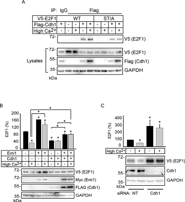 E2F1 is the target of multiple ubiquitin E3 ligases, which regulate its turnover. For example, the anaphase promoting complex/cyclosome E3 ligase activated by Cdc20 (APC/CCdc20) and SCFSkp2, respectively mediate E2F1 degradation during prometaphase and the S/G2 phases of the cell cycle [22, 23]. Recently, activation of APC/C by Cdh1 was shown to mediate E2F1 degradation via K11 linkage-specific ubiquitylation in M and early G1 phases, times during which Cdc20 is not present [24]. Significantly, induction of differentiation in human keratinocytes is accompanied by downregulation of CDC20 and SKP2 expression, with concomitant upregulation of FZR1 transcripts, which encode Cdh1 [25]. Thus, we reasoned that Cdh1 might be a reasonable candidate to participate in E2F1 degradation during keratinocyte differentiation. These considerations prompted us to first investigate whether Cdh1 interacts with E2F1 in keratinocytes. To this end, we exogenously expressed wild type V5-tagged E2F1 together with FLAG-tagged Cdh1 in undifferentiated keratinocytes, or in cells that were induced to differentiate by culture in High Ca2+ for 24 h. We were able to detect E2F1 in Cdh1 immune complexes in cells cultured both in Low and High Ca2+ medium (Figure 8A). We conducted similar experiments to investigate if the lower levels of E2F1 ST/A K11-linked ubiquitylation in differentiated keratinocytes were associated with a decreased ability of this mutant protein to bind Cdh1-containing complexes. We were able to detect E2F1 ST/A in Cdh1 immunoprecipitates isolated from both undifferentiated and differentiated keratinocytes. Thus, although S403 and T433 are dispensable for Cdh1 association with E2F1, they appear to be functionally limiting for K11-linked polyubiquitylation and susceptibility to degradation specifically in differentiated cells (Figure 8A).