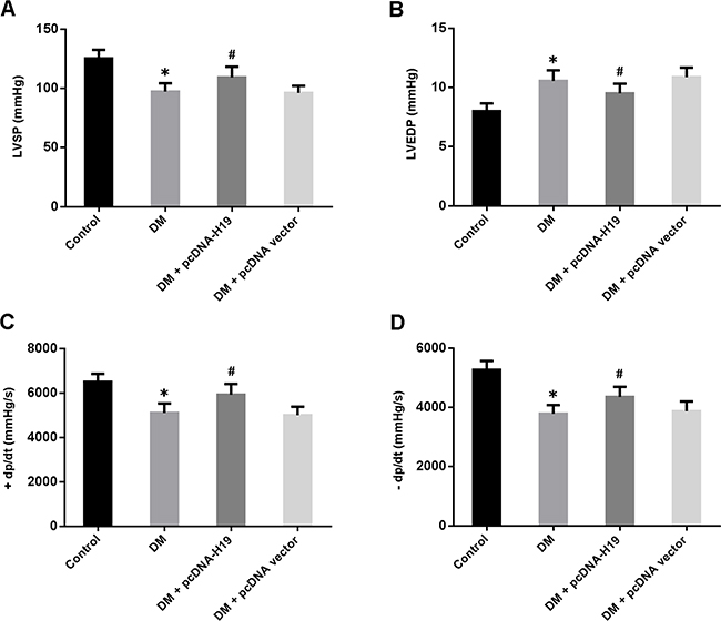 Figure 2: Overexpression of H19 improves cardiac function in diabetic rats. A. left ventricular systolic pressure (LVSP); B. left ventricular end-diastolic pressure (LVEDP); C. maximal ascending rate of left ventricular pressure (+dp/dt); D. maximal descending rate of left ventricular pressure (-dp/dt). * P<0.05 compared with control; # P<0.05 compared with DM (n=5 rats per group).