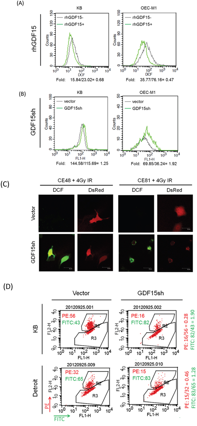 Figure 2: GDF15 suppresses the intracellular reactive oxygen species levels by altering the mitochondrial membrane potential. A. Administration of rhGDF15 suppressed intracellular ROS level in HNC cells. KB and OECM1 cells were treated with 20 ng/ml of rhGDF15 for 5 days. After staining with DCF dye, the cells were subjected to flow cytometric analysis to determine the intracellular ROS levels. All values are presented as fluorescence intensity. B. GDF15 silencing increased ROS production in HNC cells. After transfection with GDF15sh or the vector plasmids, the KB and OECM1 cells were stained with DCF dye and subjected to flow cytometric analysis. C. GDF15 silencing increased ROS production in esophageal cancer cells. CE48T/VGH and CE81T/VGH cells were co-transfected with DsRed and GDF15sh/vector plasmids and then subjected to 4 Gy of irradiation. After staining with DCF dye, the cells were subjected to confocal microscopy. D. GDF15 silencing reduced mitochondrial membrane potential and led to apoptosis in HNC cells. KB or Detroit cells were transfected with the GDF15sh or the vector plasmids for 48 h. After incubating with MitoCapture reagents, the cells were subjected to flow cytometry analysis. The PE fluorescence fraction represents healthy cells, and the FITC fraction represents apoptotic cells.
