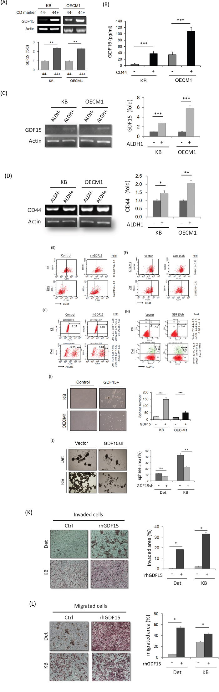 Figure 3: GDF15 promotes cancer stemness via facilitation of CD44+ and ALDH1+ cell populations. A. Elevation of GDF15 mRNA expressions in CD44+ sorted cells compared to the CD44- cells in both KB and OECM1 cell lines, as determined by RT-PCR method (n=3). B. Elevation of GDF15 protein levels in the conditional medium of CD44+ sorted cells compared to the CD44- cells in both KB and OECM1 cell lines, as determined by ELISA method (n=3). C. Elevation of GDF15 mRNA expressions in ALDH1+ sorted cells compared to the ALDH1- cells in both KB and OECM1 cell lines, as determined by RT-PCR method (n=3). D. Elevation of CD44 mRNA expressions in ALDH1+ sorted cells compared to the ALDH1- cells in both KB and OECM1 cell lines, as determined by RT-PCR method (n=3). E. Elevation of CD44+ population in rhGDF15 treated cells compared to non-treated cells in both KB and Detroit cell lines, as determined by FACS method. F. Reduction of CD44+ population in GDF15sh transfected cells in both KB and Detroit cell lines, as determined by FACS method. G. Elevation of ALDH1+ population in rhGDF15 treated cells in both KB and Detroit cell lines, as determined by FACS method. H. Reduction of ALDH1+ population in GDF15sh transfected cells in both KB and Detroit cell lines, as determined by FACS method. I. Enhancement of spheroid cell formation in the GDF15+ sorted cells compared to GDF15- cells in both KB and OECM1 cell lines (n=3). J. Reduction of spheroid cell formation in GDF15sh transfected cells in both Detroit and KB cell lines (n=3). K. Increase of invasion ability in the rhGDF15 treated cells compared to non-treated cells (control) in both Detroit and KB cell lines (n=3). L. Increase of migration ability in the rhGDF15 treated cells compared to non-treated cells (control) in both Detroit and KB cell lines (n=3). (*: p<0.05, **: p<0.01, ***: p<0.001, n.s.: non-significance, t-test).