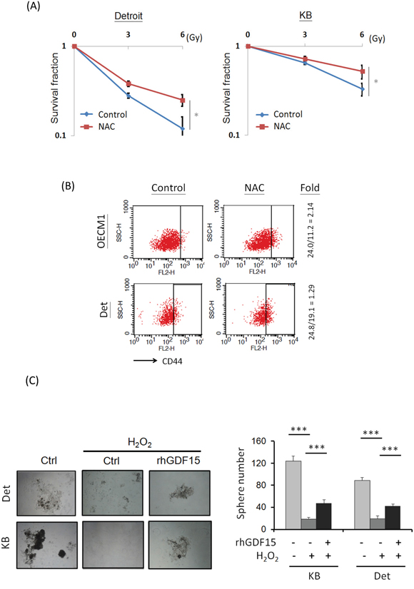 Figure 4: GDF15 modulates cellular ROS levels to promote cancer stemness. A. Treatment of antioxidant agent led to radioresistance in HNC cells. After treatment of 10 μM N-acetylcysteine (NAC) for 48 h, Detroit or KB cells were subjected to serial dose of irradiation (0 to 6 Gy). Fourteen days later, the numbers of surviving cell colonies were determined (n=3). B. Treatment of antioxidant agent increase CD44+ cell population. After treatment of 10 μM NAC for 48 h, the OECM1 or KB cells were subjected to flow cytometry analysis for CD44+ populations. C. GDF15 reversed the effects of ROS in the suppression of spheroid cell formation. Detroit or KB cells were treated with H2O2 (5 μM) with or without addition of rhGDF15 (20 ng/ml) for 48 h. These cells were then incubated in the spheroid cell culture condition and assessed after 14 days (n=3). (*: p < 0.05, **: p < 0.01, ***: p < 0.001, t-test).