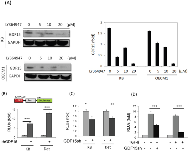 Figure 5: GDF15 regulates cellular functions through similar downstream pathway of TGF-β. A. GDF15 expression was reduced after treatment of TGF-β inhibitor. KB and OECM1 cells were treated with serial doses of LY364947 (5 to 20 μM) for 24 h. Cellular protein was extracted and subjected to western blot analysis to assess GDF15 protein expression. B. Administration of rhGDF15 increased TGF-β downstream molecule PAI-1 luciferase reporter activity. KB or Detroit cells were transfected with luciferase reporter plasmid carrying PAI-1 gene, with or without addition of rhGDF15 (20 ng/ml). After 48 h, cells were harvested for measurements of luciferase activity (n=3). C. Silencing rhGDF15 suppressed PAI-1 luciferase reporter activity. KB or Detroit cells were transfected with luciferase reporter plasmid carrying PAI-1 gene, with or without co-transfection of GDF15sh plasmid. After 48 h, cells were harvested for measurements of luciferase activity (n=3). D. PAI-1 expression induced by TGF-β was suppressed following GDF15 silencing. KB or Detroit cells were transfected with luciferase reporter plasmid carrying PAI-1 gene, with or without addition of rhGDF15 (20 ng/ml), or with or without co-transfection of GDF15sh plasmid. After 48 h, cells were harvested for measurements of luciferase activity (n=3). (*: p < 0.05, **: p < 0.01, ***: p < 0.001, t-test).