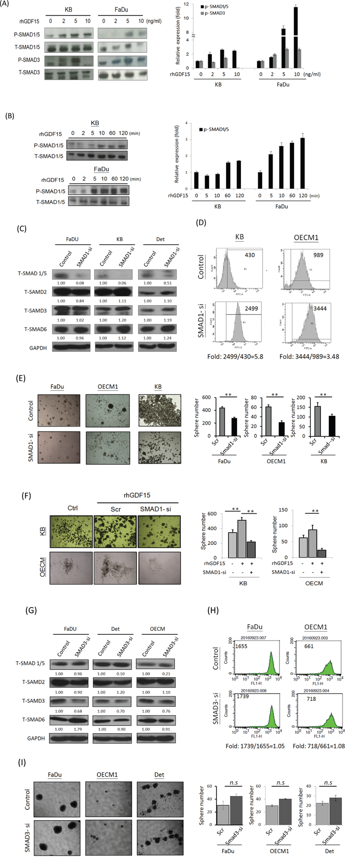 Figure 6: GDF15 regulates cellular functions via a SMAD-associated signaling pathway. A, B. Administration of rhGDF15 increased the phosphorylated forms of SMAD family proteins in HNC cells. KB or FaDu cells were treated with serial doses of rhGDF15 (0-10 ng/ml) for 15 min (A) or 5 ng/ml rhGDF15 for various times (0-120 min) (n=3). (B) The cellular proteins were extracted and subjected to western blot analysis for SMAD family protein expressions (n=3). C. Effects of SMAD1-siRNA on the expressions of SMAD family proteins. After transfection of SMAD1-specific siRNA or the scramble oligonucleotides in HNC cells for 48h, cellular proteins were extracted for western blot analysis. GAPDH protein was used as an internal control (n=3). D. Silencing SMAD1 increased ROS level in HNC cells. KB or OECM1 cells were transfected SMAD1 specific siRNA or the scramble oligonucleotides for 48 h. After treating cells with 10 μM H2O2 for 20 min, the Intracellular ROS levels were determined by DCF dye staining and analyzed with flow cytometry. E. Silencing SMAD1 suppressed spheroid cell formation in HNC cells. Fadu, OECM1 or KB cells were transfected SMAD1 specific siRNA or the scramble oligonucleotides for 48 h. These cells were then incubated in the spheroid cell culture condition and assessed after 14 days (n=3). F. The spheroid cell formation promoted by GDF15 was inhibited in SMAD knockdown HNC cells. KB or OECM1 cells were transfected SMAD1 specific siRNA or the scramble oligonucleotides for 48 h, with the addition of rhGDF15 (20 ng/ml). These cells were then incubated in the spheroid cell culture condition and assessed after 14 days (n=3). G. Effects of SMAD3-siRNA on the expressions of SMAD family proteins. After transfection of SMAD3-specific siRNA or the scramble oligonucleotides in HNC cells for 48h, cellular proteins were extracted for western blot analysis. GAPDH protein was used as an internal control (n=3). H. Silencing SMAD3 had no effect on ROS level in HNC cells. Fadu or OECM1 cells were transfected SMAD3-specific siRNA or the scramble oligonucleotides for 48 h. After treating cells with 10 μM H2O2 for 20 min, the Intracellular ROS levels were determined by DCF dye staining and analyzed with flow cytometry. I. Silencing SMAD3 had no significant effect on spheroid cell formation in HNC cells. Fadu, OECM1 or Detroit cells were transfected SMAD3 specific siRNA or the scramble oligonucleotides for 48 h, with the addition of rhGDF15 (20 ng/ml). After 14 days of incubation in the spheroid cell culture condition, cells were assessed for spheroid formation (n=3). (*: p < 0.05, **: p < 0.01, ***: p < 0.001, n.s.: non-significance, t-test).
