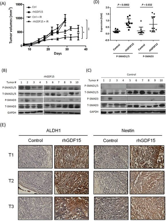 To determine whether the differential tumor growth associated with the rhGDF15 treatment was related to SMAD1 activation and stemness conversion, the xenografted tumors were dissected, and protein expression was examined using western blot and immunohistochemistry assays. The results of the two sets of xenografted tumors receiving irradiation were shown in Figure 7B-7D. Although there was variation between individual tumors, the pSMAD1/5 and pSMAD3 levels were generally higher in the rhGDF15-treated xenografts (Figure 7B) compared to the controls (Figure 7C), with average elevations of 2.0-fold (P = 0.0002) for pSMAD1/5 and 1.6-fold (P = 0.032) for the pSMAD3 proteins (Figure 7D). The results of immunohistochemistry staining for the cancer stemness marker proteins ALDH1 and Nestin in the dissected xenograft tumors are shown in Figure 7E. In all tumors examined, the rhGDF15-treated tumors exhibited a strong staining of these two proteins in the entire tumor mass compared to the controls. These results suggested that GDF15 conferred radioresistance in vivo through SMAD activation and stemness conversion.