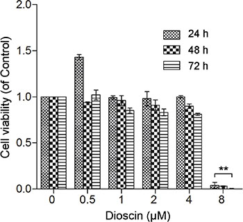 Figure 1: Effect of dioscin on B16 cell viability. B16 cells were seeded at a density of 1 × 104 cells in 96-well culture plates and treated with dioscin (0, 0.5, 1, 2, 4 and 8 μM) for 24, 48 and 72 h. Cell viability was examined by the MTT assay. **P < 0.01, compared with control.