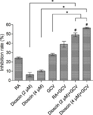 Figure 3: Enhanced growth inhibition of mixture of B16tk-GFP cells and B16RFP cells by dioscin plus GCV combination. Stable B16tk-GFP cells were mixed with B16RFP cells at a ratio of 3:7. The mixed cells were treated with 10 μM RA (positive control), dioscin (2 and 4 μM) or DMSO (negative control) for 24 h and then supplemented with or without GCV (15 μM) for an additional 48 h before examination by the MTT assay. *P < 0.05. GCV combined with dioscin (2 and 4 μM) showed a synergistic inhibitory effect on the growth of mixed B16 cells (#Q = 1.52 and 1.60, respectively, > 1.15).