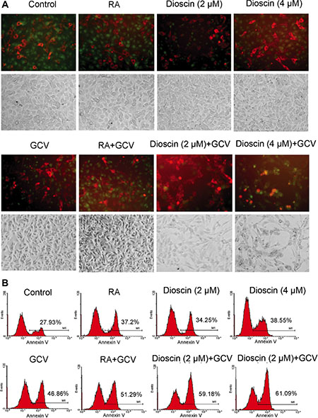 Figure 4: Enhancement of bystander effect of HSV-tk/GCV-mediated gene therapy against B16 cells by dioscin treatment. Stable B16tk-GFP cells were mixed with B16RFP cells at a ratio of 3:7 and treated with 10 μM RA (positive control), dioscin (2 and 4 μM) or DMSO (negative control) for 24 h and then supplemented with or without GCV (15 μM) for an additional 48 h. The treated cells were then observed by fluorescence microscopy and also assessed by flow cytometry with annexin V staining. (A) Representative fluorescence microscopy images. The aggregation of red fluorescence indicated apoptosis of stable RFP-expressing cells. (B) Apoptotic rates of RFP cells were analyzed by flow cytometry.