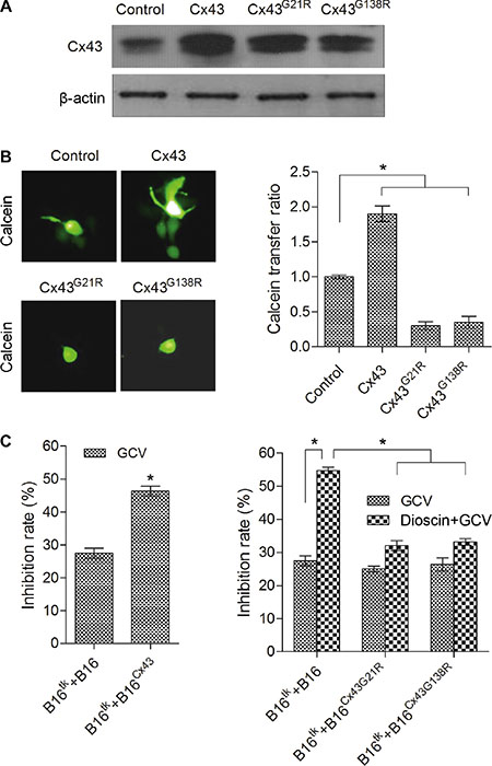 Figure 5: Attenuation of dioscin-induced bystander effect of suicide gene therapy in B16 cells by dominant negative Cx43. (A) Expression levels of wild-type Cx43 and mutant Cx43 (Cx43G21R and Cx43G138R) correspondingly in B16Cx43, B16Cx43G21R and B16Cx43G138R stable cell lines were examined by immunoblotting using an antibody against Cx43. (B) Dominant negative mutants of Cx43 (both Cx43G21R and Cx43G138R), contrary to over-expression of wild-type Cx43, impaired the GJIC. A 1:100 mixture of donor stable B16 cells (pre-labeled with Calcein AM) and recipient B16 stable cells was co-cultured for 6 h and observed by fluorescence microscopy (left panel). The ratio of green recipient cells (Calcein-positive) vs. donor cells was used to evaluate the transfer of Calcein as an indication of GJIC function. The right panel shows the quantification from three independent experiments. *P < 0.05, compared with control. (C) Impact of the gain or loss of Cx43 on the bystander effect of the HSV-tk/GCV gene therapy system against B16 cells. B16tk cells were mixed with HSV-tk-negative B16 cells (B16 cells, B16Cx43 cells, B16Cx43G21R cells and B16Cx43G138R cells) at a ratio of 3:7. The mixed cells were treated with GCV (15 μM) alone or the combination of GCV (15 μM) and dioscin (4 μM) for 48 h followed by MTT assay. *P < 0.05.