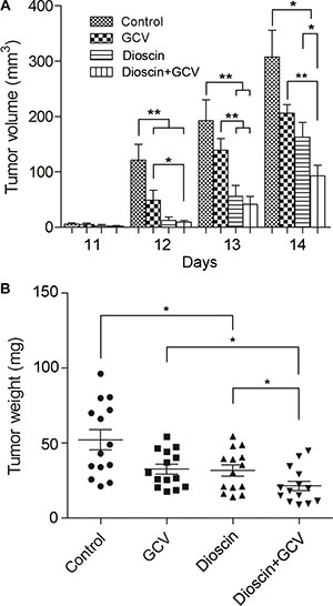 Figure 6: Synergistic inhibition by dioscin and GCV of tumor growth in a mixed population of B16tk cells and wild-type B16 cells in vivo. Subcutaneous B16 tumors were established in C57BL/6J mice using B16tk cells and wild-type B16 cells mixed at a ratio of 3:7. Mice were then divided into four treatment groups (n = 14 mice per group) : control (saline only), GCV only (100 mg/kg·day), dioscin only (50 mg/kg·day), and GCV plus dioscin. (A) Tumor volume was measured from day 11, once a day for 4 days. (B) Tumor weight was measured on day 14 following treatment. Data are presented as the mean ± standard error. *P < 0.05; **P < 0.01.