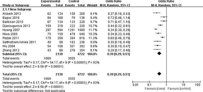 Figure 6: Subgroup analysis of the association between XRCC1 Arg399Gln polymorphism and the risk of cervical cancer stratified by ethnicity in heterozygous model. CI: confidence interval; OR: odds ratio.
