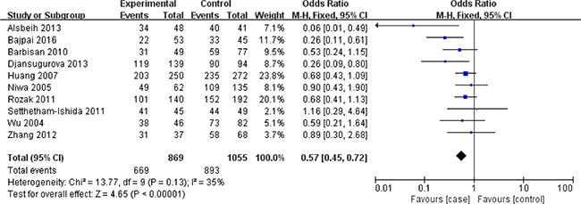Figure 2: Meta-analysis of the association between XRCC1 Arg399Gln polymorphism and the risk of cervical cancer in allele model. CI: confidence interval; OR: odds ratio.
