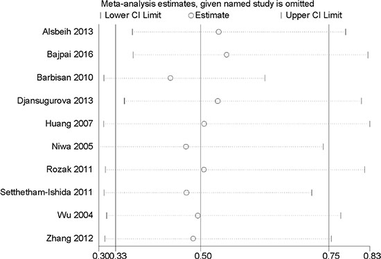 Figure 7: Sensitivity analysis of the association between XRCC1 Arg399Gln polymorphism and the risk of cervical cancer in homozygous model.