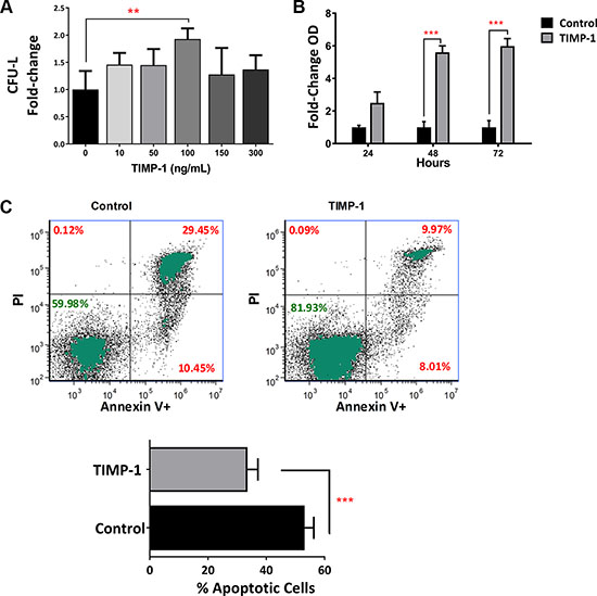 Figure 2: Clonogenic output and survival of leukemic blasts is positively enhanced by exposition to TIMP-1. Circulating leukemic blasts were isolated from AML patients (n = 12) and cultured in semisolid medium in the presence of TIMP-1. After 14 days, the total CFU-L output was assessed as above described. (A) The clonogenic output of the AML-derived leukemic cells was significantly stimulated by TIMP-1 (100 ng/ml, **p ≤ 0.01). No other concentration of TIMP-1 were effective. The results are expressed as growth fold change versus untreated control samples. The mean number of colonies in untreated (0 ng/ml) and treated (100 ng/ml) AML samples was 18.8 ± 5.8 vs 30.2 ± 9.2, respectively. Specifically, only 2 patients (PT #6 and #13 in the Table patients) were not responsive to TIMP-1 treatment in CFU-L assay. Data are presented as mean ± SEM of 12 patients, the error bars are the mean of each duplicate. Survival of leukemic blasts from AML patients is positively enhanced by TIMP-1. (B) AML blasts were cultured for 24-48-72 hrs in the presence of TIMP-1 (48–72 hrs, ***p ≤ 0.001; n = 3). Survival rate is evaluated by cell titer assay and expressed as fold-change taking the value of untreated cells at each time point as 1. (C) AML cells from 14 patients were in vitro treated for 2 days with TIMP-1 and the percentage of cell viability was assessed after AnnexinV/PI staining, as described in methods. Representative dot-plots showing the percentage of live, apoptotic and necrotic cells in leukemic blasts as determined by flow cytometry. Mean of percentage in apoptotic cell (Annexin V positive and both Annexin V/ PI positive cells) in the presence or absence of TIMP-1 (***p ≤ 0.001). The mean percentage of apoptotic cells (Annexin V positive and both Annexin V/ PI positive cells) was 53.0 ± 3.1% (range: 34.5–74.6) for control and 33.0 ± 3.5% (range: 15.4–53.0) for TIMP-1 treated cells. Data are presented as mean ± SEM.