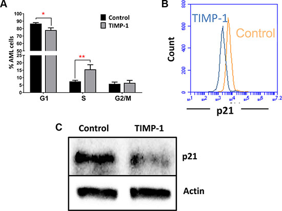 Figure 3: TIMP-1 promotes cell cycle of leukemic blasts. (A) Results are expressed as the percentage of cells in different phases of the cell cycle. TIMP-1 promote cell cycling of leukemic blasts cells from AML patients (phase G1 *p ≤ 0.05 and phase S **p ≤ 0,01; n = 9). Their distribution in the different phases of cell cycle was assessed by PI staining after 24 hrs. Data are presented as mean ± SEM. (B) Representative histogram of p21WAF1/CIP1 of leukemic blasts after exposure to TIMP-1 for 24 hrs. The downregulation of cyclin-dependent kinase inhibitor p21WAF1/CIP1, which promotes cell cycle progression, were measured by flow cytometry as MFI, and is shown only in the presence of TIMP-1 (MFI: 2275 ± 524 TIMP-1 treated cells vs 3110 ± 223,1 untreated cells; n = 12). Specifically, only 2 patients (PT #11 and #15 in the Table patients) were not responsive to TIMP-1 treatment in p21 downregulation. (C) AML cells were incubated with TIMP-1 for 24 hrs and the relative level of p21 protein was determined by western blotting (n = 2). Representative western blot of one AML patient. β-actin was used as a loading control.
