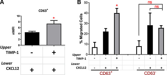 Figure 5: TIMP-1’s effects on migration are mediated by the CD63 tetraspanin receptor. (A) AML cells were seeded in the upper compartment of a chamber transwell migration assay ±TIMP-1 (100 ng/ml). After 24 hrs migrated AML-derived leukemic blasts toward CXCL12 gradient after pre-treatment with TIMP-1 show increased expression of TIMP-1 receptor (CD63) as compared with untreated cells. Results are expressed as normalized Mean Fluorescence Intensity (nMFI). (*p ≤ 0.05; n = 10). (B) Based on CD63 expression, leukemic blasts were sorted in two separate fractions, CD63– and CD63+, and their capability to respond to TIMP-1 stimulation was assessed by migration assay. AML cell fractioning were seeded in the upper compartment of a chamber Transwell migration assay ± TIMP-1 (100 ng/ml) toward CXCL12 (*p ≤ 0.05; n = 3). The mean number of migrated CD63+ cells was 705 ± 46 for spontaneous migration, 2213 ± 287 for migration toward CXCL12 gradient, 3720 ± 600 in the presence of TIMP-1 toward CXCL12 gradient. The mean number of migrated CD63–cells was 805 ± 52 for spontaneous migration, 2695 ± 555 for migration toward CXCL12 gradient, 2575 ± 370 in the presence of TIMP-1 toward CXCL12 gradient. Data are presented as mean ± SEM.