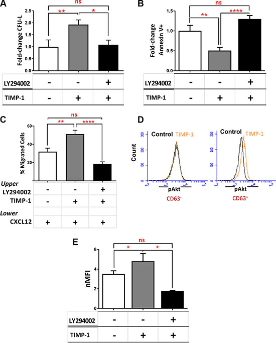 Figure 6: TIMP-1 effects in AML cells are mediated by PI3K/Akt and HIF-1α signaling axis. (A) AML cells were cultured in the presence or absence of TIMP-1 (100 ng/mL) after pre-treatment with LY294002 (20 μM) and the correspondent clonogenic output was assessed after 14 days of culture (*p ≤ 0.05; **p ≤ 0.01; n = 3). The mean number of CFU-L was 19.7 ± 5.6, 30.3 ± 9.6 and 14.0 ± 6.2 for control, TIMP-1-treated and LY294002-pre-treated AML cells, respectively. The results are expressed as growth fold-change versus untreated control samples. (B–C) In the same culture condition we tested apoptosis after 24 hrs (n = 8) and migratory behaviour toward CXCL12 gradient (**p ≤ 0.01; ****p ≤ 0.0001; n = 8). The mean numbers of migrated cells were 9032 ± 2970, 16432 ± 3881 and 8450 ± 1638 for control, TIMP-1-treated and LY294002-pre-treated AML cells, respectively. The results are expressed as fold-change versus untreated control samples and as mean of migrated cells, respectively. (D) Representative panel of pAkt levels in TIMP-1-treated versus untreated cells of CD63– leukemic blasts (left panel) or CD63+ leukemic blasts (right) (n = 3). (E) Level of Akt phosphorylation (Thr308) in total AML cells exposed for 15 minutes to TIMP-1 (100 ng/mL) or after pre-treated with LY294002, as assessed by flow cytometry. Results are expressed as normalized MFI: 3.5 ± 0.32 (MFI 1387 ± 264) untreated cells vs 4.8 ± 0.7 (MFI 1524 ± 274) TIMP-1 treated cells (*p ≤ 0.05; n = 13). Specifically, only 3 patients (PT #4-#7-#8 in the Table patients) were not responsive to TIMP-1 treatment in pAkt activation (*p ≤ 0.05; n = 13).