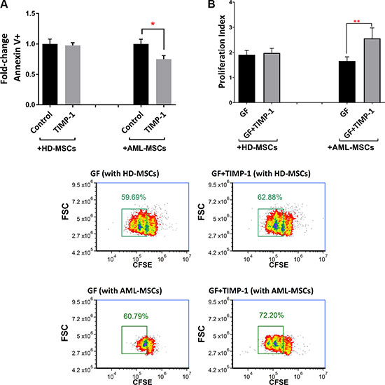Figure 8: TIMP-1’s effects on BM microenvironment: TIMP-1 promotes cell survival and proliferation in AML-derived blasts in the presence of AML-MSCs. (A) AML cells were co-cultured with normal (n = 2) or leukemic MSCs (n = 3) for 3 days ± TIMP-1 (100 ng/ml) to test survival of leukemic cells (*p < 0.05; n = 4). (B) AML cells were co-cultured with normal or leukemic MSCs for 5 days with growth factors ± TIMP-1 (100 ng/ml). Proliferation index of CFSE-labeled leukemic blasts was calculated. Cells maintained in culture in the presence of medium alone was evaluated as 1 of proliferation index. AML MSCs displayed, at culture day 5, a significantly increased proliferation index, as compared to leukemic cells co-coltured with normal MSCs (**p ≤ 0.01; n = 12). (C) Representative dot-plots showing the percentage of proliferative cells gated with reduced CFSE content by flow cytometry. Left panels, AML cells were co-cultured with normal (on the top) or leukemic MSCs (on the bottom) for 5 days with growth factors only. Right panels, AML cells were co-cultured with normal (on the top) or leukemic MSCs (on the bottom) for 5 days with growth factors ± TIMP-1. Data are mean ± SEM. GF, growth factors.