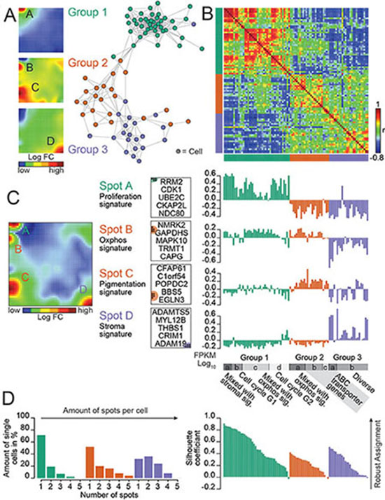 Figure 1: Dissecting heterogeneity in a BRAF/NRAS wild type patient-derived melanoma culture revealed by single-cell RNA-seq. (A) A similarity network illustrates the diversity of single-cell expression landscapes. Three major groups of cells color-coded in green, red and purple are identified. Expression landscapes are visualized as mean SOM expression portraits of each group. Group-specific modules (A–D) of co-regulated genes are identified. (B) Pairwise correlation heatmap quantifies the mutual similarity of single-cell expression landscapes as Pearson’s correlation coefficient (r). An anti-correlation for group 1 cells compared to cells of group 2 and 3 is discovered. (C) Mean SOM expression portrait of all cells illustrates the distribution of main expression spots across the SOM landscape. Spot-specific genes which could be assigned to different functional signatures (Proliferation, Oxphos, Pigmentation and Stroma) are identified. Top 5 genes of each spot defining the assignment to a functional group are shown for each spot. A refined analysis discovered subgroups (a–d) which are associated with different functions, e.g., different phases of cell cycle and ABC-membrane transporters. (D) Number of over-expression spots per cell increases from group 1 to group 3 revealed by the spot number distribution. Quality of cluster assignment is demonstrated by a silhouette plot. Genbank database accession number: GSE81383.