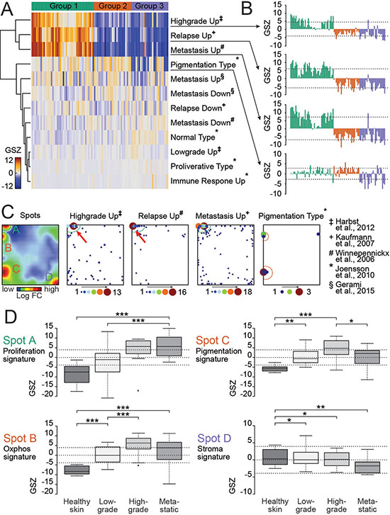 Expression of top 100 genes from each spot-cluster (A–D) was analyzed in a further independent data set [21] (Figure 2D). Our cell signatures of spot B (Oxphos) and C (Pigmentation) show maximum expression in high grade primary melanomas whereas spot signature A (Proliferation) shows strongest expression in high-grade and metastatic melanomas (Figure 2D). Spot D (Stroma) shows downregulation during tumor progression [21]. Hence, high similarities of gene activity of our proliferation signature were found in high grade primary and metastatic tumors.