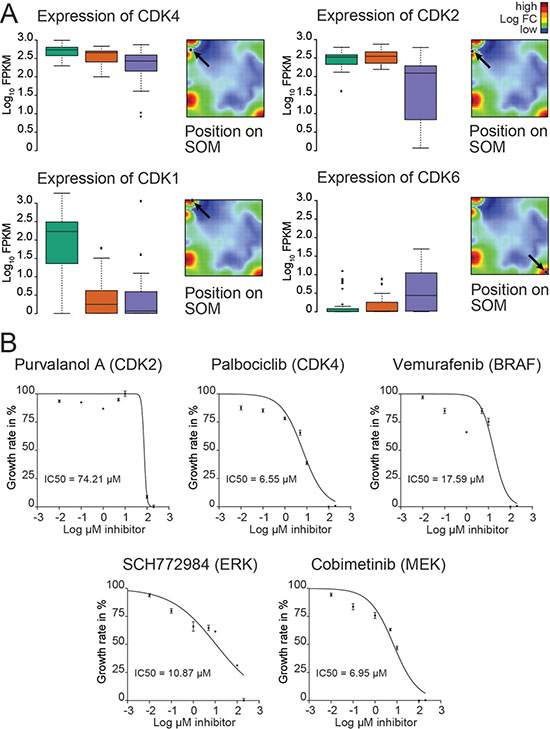 Figure 3: Kinome analysis of the BRAF/NRAS wild type culture reveals potential targets for clinical treatments. (A) Gene expression levels of 4 cyclin-dependent kinases (CDK1, CDK2, CDK4 and CDK6) are analyzed for each of the 3 identified main groups. Data are given as standard box plots. CDK2 and CDK4 are consistently highly expressed in all groups. Positions of each CDK gene are shown on the mean SOM expression landscape indicated by arrows. (B) Growth inhibition curves are shown for treatments of a patient-derived melanoma short-term culture using inhibitors directed against CDK2 (purvanolol), CDK4 palbociclib, activated BRAF (vemurafenib), ERK1/2 (SCH772984), and MEK1/2 (cobimetinib).