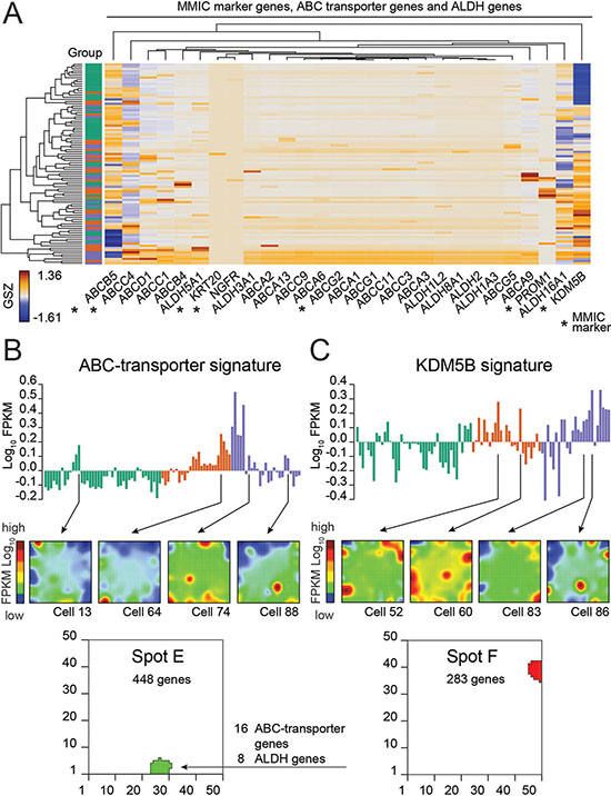 Figure 4: Expression of marker genes of melanoma stem or initiating cells (MMIC). (A) Heatmap showing scaled expression of MMIC marker genes [23] (e.g., ABCB5, KDM5B and ABCC4), various ABC-transporters and ALDH genes. Additional ABC-transporters and ALDH genes shown are all co-expressed in spot E (Supplementary Figure S5). Rows represent single cells. (B) Expression profile of spot E comprising 16 ABC-transporter and 8 ALDH genes. Selected expression portraits of cells expressing these genes are shown. (C) Expression profile of spot F where KDM5B (JARID1B) is heterogeneously expressed across single cells analyzed. Selected expression portraits of cells expressing KDM5B (JARID1B) are shown.