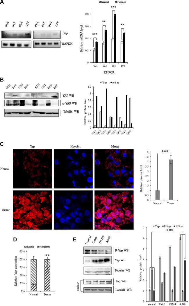 Figure 1: Upregulation of YAP in lung cancer cells. (A) Gel-based RT-PCR with densitometric quatitation demonstrating elevated expression of YAP in human NSCLC tissues compared with their normal adjacent lung tissues. (B) Immunoblotting with densitometric quantitation demonstrating increased protein level of Yap and decreased p-YAP in human NSCLC tissues compared with their normal adjacent lung tissues. (C, D) Immunofluorescent staining of Yap proteins showing increased YAP accumulated in nuclear in NSCLC samples compared with their normal adjacent lung tissues while more YAP was localized in cytoplasm of those normal adjacent lung tissues. (E) Immunoblotting with densitometric quantitation demonstrating increased protein level of total Yap as well as nuclear Yap and decreased p-YAP in Calu-6, H1299, and A549 cells than normal cell line. **P < 0.001 ***P < 0.0001 by Student’s t-test