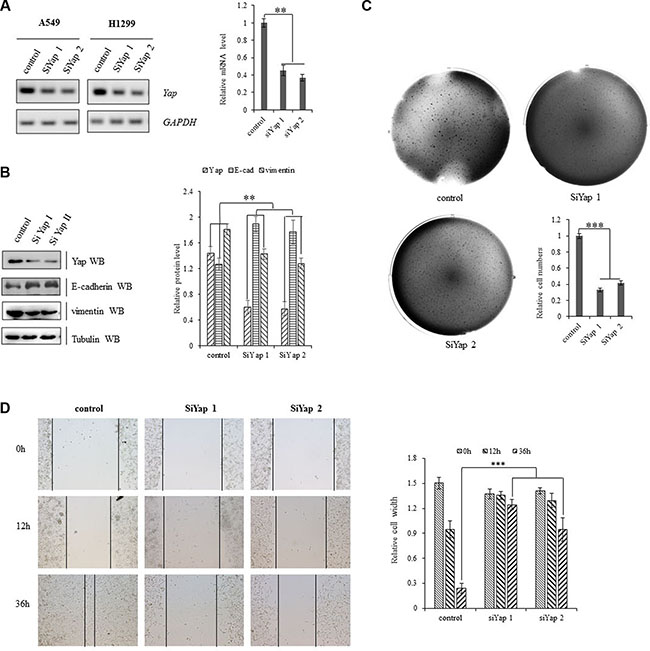Figure 2: Activation of YAP drives NSCLC progression. (A) Knockdown of YAP decreased transcription activity of YAP in A549 and H1299 cells as shown in Gel-based RT-PCR with densitometric quantitation. (B) Immunoblotting with densitometric quantitation demonstrating decreased YAP and Vimentin protein expressions and increased E-cadherin protein level in A549 cells with siRNA-YAP treatment. (C) Knockdown of Yap arrested clonal formation to delay the clonogenecity of A549 cells. (D) Scratch test showing that knockdown of Yap significantly decreased scar healing rates at 36 hours after siRNA-YAP treatment in A549 cells. **P < 0.001 ***P < 0.0001 by Student’s t-test.