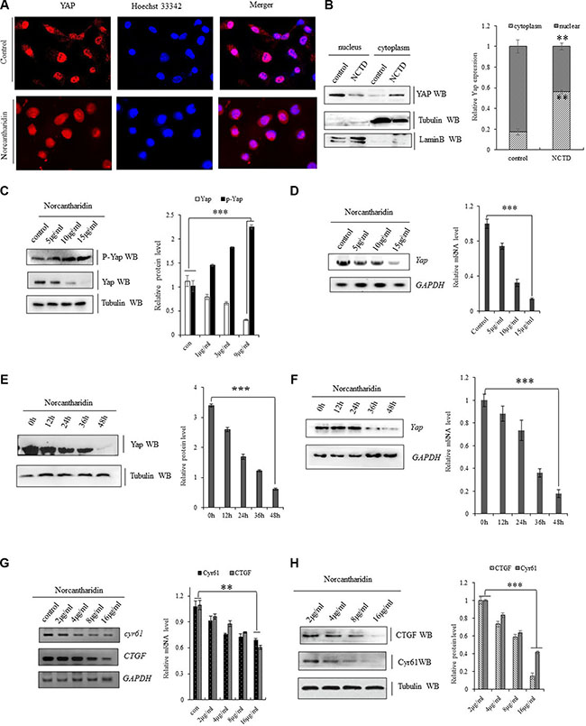 Figure 3: NCTD represses YAP signaling pathway. (A) Immunofluorescent staining of Yap proteins demonstrating that NCYD treatment at 8 μM for 36 hours enhanced the translocation of Yap from nuclear to cytoplasm in A549 cells. (B) Immunoblotting showing decreased YAP in nuclear and relatively enriched inside cytoplasm in A549 cells treated with NCTD at 8 μM for 36 h. (C, D) NCTD dose-dependently reduced Yap mRNA(C) and protein level (D, G), but increased phosphorylated YAP (D) in A549 cells for 72 hours. (E, F) NCTD time-dependently reduced Yap mRNA(E) and protein level (F) in A549 cells at 15 μΜ. (G, H) NCTD dose-dependently decreased CYR61 and CTGF at both mRNA(G) and protein (H) level from 2 μM to 16 μM in A549 cells for 72 hours. **P < 0.001 ***P < 0.0001 by Student’s t-test.