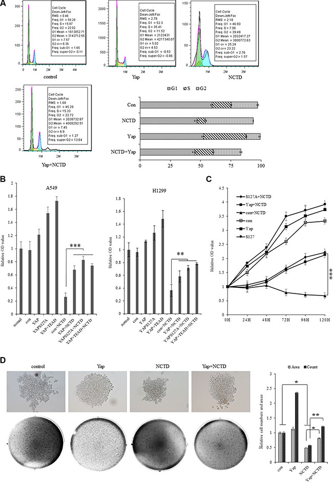 Figure 4: NCTD interferes the YAP-mediated NSCLC cell proliferation. (A) Treatment of NCTD at15 μM for 72 h induced significant G2 arrests and Yap blocks the effect of NCTD in A549 cells as showing in both representative histograms of cell cycle distribution and their quantitation analysis. (B) In vitro proliferation assay demonstrating that NCTD at 15 μM significantly arrested cellular proliferation of A549 and H1299 cells with or without stably expressing YAP, YAPS127A, YAP and TEAD for 72 hours. (C) Cell growth assay showing that NCTD at 15 μM time-dependently and significantly arrested cellular proliferation of A549 cells with or without stably expressing YAP, YAPS127A, YAP and TEAD. (D) Soft agar colony formation assay demonstrating that ectopic expression of Yap significantly enhanced colony formation density which was blocked by NCTD at 15 μM for 72 hours in H1299 cells. ***P < 0.0001 by Student’s t-test.