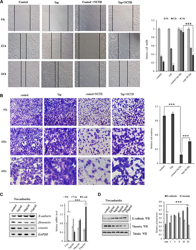 Figure 6: NCTD interferes the Yap-mediated NSCLC cell invasiveness and EMT. (A) Scratch assay showing treatment of NCTD at 15 μM for 12–24 hours dramatically decreased Yap-induced enhancement in A549 cell migration. (B) Matrigel invasion assay identified that treatment of NCTD at 15 μM for 72 hours dramatically decreased cell invasive growth and overexpressing YAP partially blocked NCTD-induced inhibition in cell invasive growth. (C, D) NCTD dose-dependently increased E-cadherin and increased fibronectin and vimentin in mRNA(C) and protein (D) level in A549 cells for 72 hours. ***P < 0.0001 by Student’s t-test. **P < 0.001 ***P < 0.0001 by Student’s t-test.