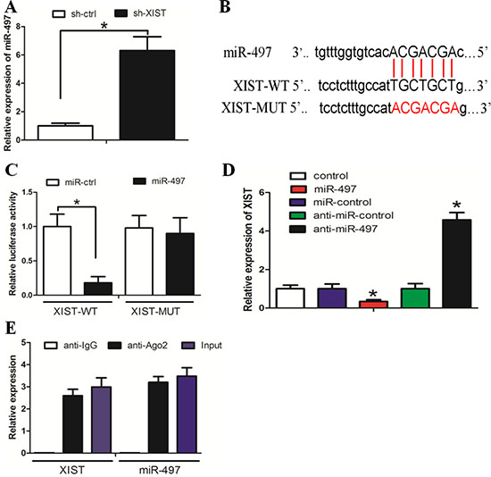 Figure 3: Reciprocal repression between lncRNA XIST and miR-497 in HGC-27 cells. (A) MiR-497 expression was increased in sh-XIST cells when compared with sh-ctrl cells. (B) The binding sites of miR-497 on XIST. (C) Co-transfection of miR-497 and XIST-Wt strongly decreased the luciferase activity, while co-transfection of miR-control and XIST-Wt did not change the luciferase activity. Co-transfection of miR-497 and XIST-Mut did not change the luciferase activity either. (D) MiR-497 decreased XIST expression. (E) XIST and miR-497 were enriched in Ago2 immunoprecipitates relative to control IgG immunoprecipitates.