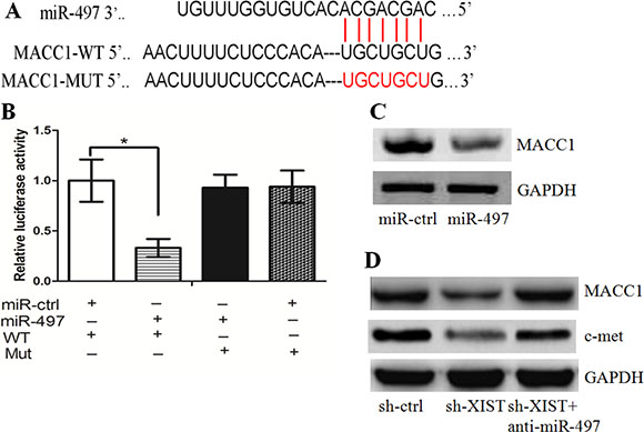 Figure 4: miR-497/MACC1 axis mediated the effect of XIST on HGC-27 cell growth and invasion. (A) The binding sites of miR-497 on MACC1. (B) The luciferase assay showed that cells transfected with miR-497 had less luciferase activity than those transfected with miR-ctrl. (C) miR-497 repressed MACC1 protein expression in HGC-27 cells. (D) Anti-miR-497 treatment led to the restoration of MACC1 in sh-XIST cells.