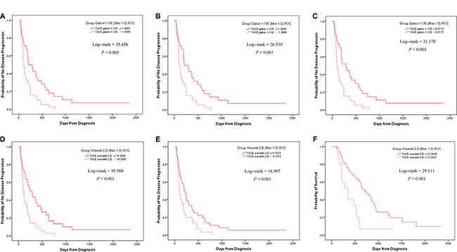 Figure 1: Kaplan-Meier analyses for TTP in TACE patients. When separated by the ROC threshold of Gabor-1–90 at filter 0, the two subgroups had a statistical difference in TTP (A). Similar results could be achieved by the threshold of Gabor-1-135 at filter 1.0 (B), Gabor-1-135 at filter 1.5 (C) wavelet-2-D at filter 1.0 (D) and wavelet-2-D at filter 1.5 (E). When separated by the threshold of wavelet-3-D at filter 1.0, the two subgroups had a statistical difference in OS (F).