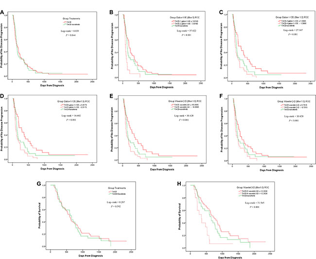 Although 5 parameters proved to be related to TTP, it is necessary to identify the best indicators in order to facilitate clinical application, and avoid contradiction by classification using different parameters. Based on the potential survival benefit afforded by sorafenib, we aimed to select the most appropriate patients. Therefore, when separated by Gabor-1-135 (filter 1.0), Gabor-1-135 (filter 1.5), or wavelet-2-D (filter 1.0), TTP still showed statistically significant differences between the lower value group (such as TACE-3) and the TACE+Sorafenib group. This indicated that some appropriate patients remained unidentified; these parameters were therefore inferior to Gabor-1-90 (filter 0) and wavelet-2-D (filter 1.5). In Cox regression analysis of the total patient group, subgrouping by wavelet-2-D (filter 1.5) did not result in statistically significant differences; therefore, Gabor-1-90 (filter 0) was the best parameter for determining benefit of TTP (Figure 3).